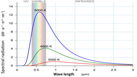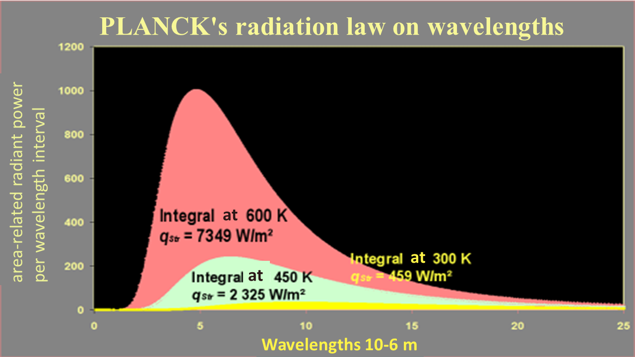 The area under the wavelength-specific spectral radiance increases with the fourth (!) potency of the temperature of the emitting body. Shown here for the temperatures: