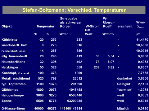 At first glance, the radiant output of the skin seems very high \\- but a similarly high radiant power also comes back; \\what is relevant for the perception is the difference between emitted and absorbed/received energy Zustrahlung?? (5th column).
