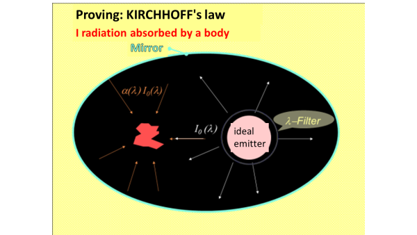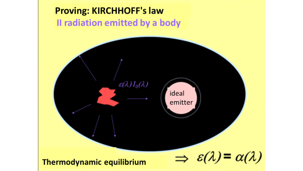 Proving KIRCHHOFF's law of thermal radiation: this is simply a consequence of the second law of thermodynamics. If $\alpha$ differed from α at a wavelength, then a body (red) that is in equilibrium with the ideal emitter would spontaneously heat up at the expense of the black body.