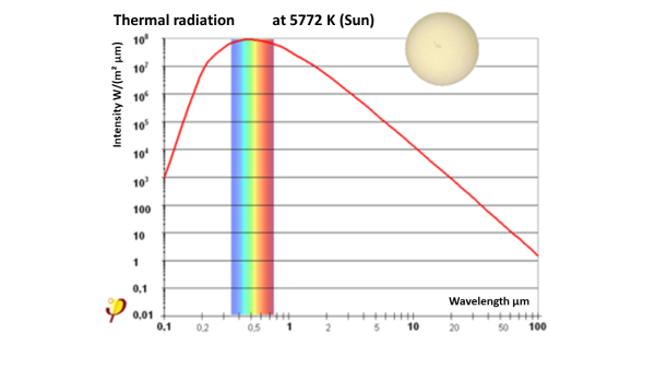 Example: Sun: surface temperature 5800 K, maximum/peak thermal radiation at 500 nm