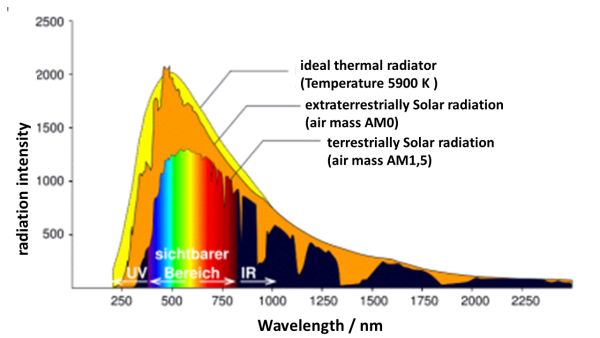 Outside the Earth's atmosphere (“extra-terrestrially”) the solar spectrum is relatively similar to that of an “ideal emitter”, which in physics is also called a “black body emitter” or “black body” because it can absorb (and thus also emit) all thermal radiation at all wavelengths without hindrance. The deviations stem from changes in the radiation in the solar atmosphere itself. Much more radiation results at the temperature of the Sun's surface and with shorter wavelengths; the maximum radiation is then about 500 nm, in the middle of the visible spectrum.