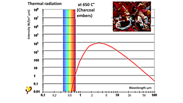 With a temperature of approximately 650 °C the thermal radiation generated here already extends into the visible spectral range, even if only in the red range. That is why charcoal is perceived to be “red hot”. The maximum radiation intensity is then in the near infrared range. Thermal radiation is sensed quite well by the temperature sensors in our skin (e.g. campfire) and is fundamentally important for a “barbecue”. The table showing the glowing colours is depicted on the right. A blacksmith for example can recognise the temperature of a manufactured item from the colour of the glowing metal. In astronomy, “red stars” also indicate comparatively low surface temperatures, while bluish radiation indicates extremely hot stars, because the peak radiation here shifts to shorter wavelengths.