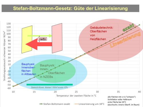 How good is such an approximation? Within the range of the relevant heat exchange processes inside the building, surprisingly good. If conventional radiators or other hot/heated objects also come into play, it is better to calculate with a higher factor. “Exact” calculation with the $T_4$ expansion can also be carried out, but one should keep in mind that other variables such as the convective heat transfer are far less precisely known, (NZEB = nearly zero energy building).