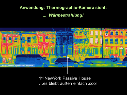 In practice: the house in the middle is NOT unheated, in fact it is comfortably warm. Due to the excellent thermally insulated exterior building assemblies, it hardly loses any heat, as a result of which the exterior surface temperature adjusts to the surroundings, and very little heat radiation is emitted. New York's '1st Passive House' appears “cool” in the thermographic image. This was a retrofit, and these results can therefore also be achieved with the existing building stock.