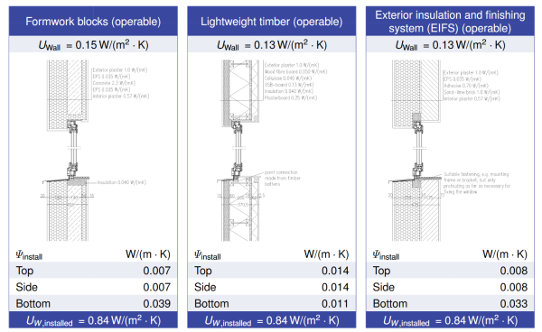 In cases where the actual installation resembles the recommendations of documented window installation thermal bridges, these figures can be used for energy calculations. Therefore, a recommended first step would be to look up the installation Psi-values of certified frames, as shown below: