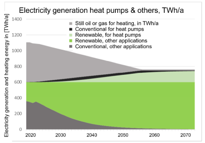 Sustainable systems for space heating are exclusively heat pumps and sustainable district heating14) . For heat pump electricity, emissions result in 198 gCO2 /kWhel on average over the next 40 years15) which makes the heat pump about two to three times better than natural gas heating 16) . In addition, the heat pump offers the well-secured potential for an almost complete reduction of greenhouse gases in the further future due to the necessary expansion of non-fossil electricity supply.