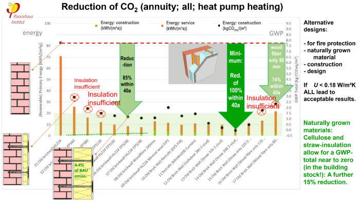 - The uninsulated construction (even with the use of a heat pump) is far outside the sustainability field with emission values that are more than a factor of 4 above the budget available for sustainable buildings (see AkkP 58, shown here as a light green band).