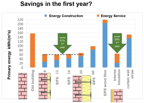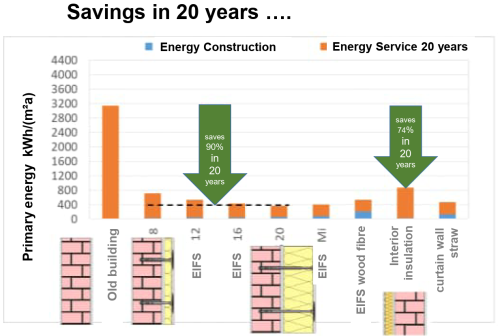 Thermal insulation materials require energy for production (so-called “grey energy”). Even in the case of conventional insulation materials, however, this is very little compared to the savings achieved by the insulation measure. In the first of the following diagrams, we compare the primary energy consumption of one square meter of uninsulated old building wall in just one year with the sum of the total production primary energy expenditure 21) and the remaining “residual consumption” for a retrofitted insulated wall in eight variants. All of them (with the exception of the wood insulation) already save a considerable amount of energy in the first year, and recover their respective production energy expenditure in the first heating period 22)