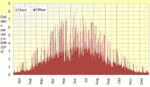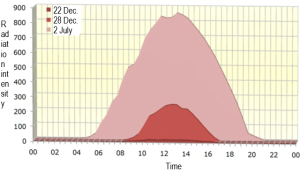 Fig. 1 shows the average seasonal distribution of solar radiation in kWh per m² and day that is typical for our latitudes based on the example of the locations Berlin and Karlsruhe. It shows the proportion of direct radiation that reaches the earth's surface directly through the atmosphere and the diffuse radiation that results from the scattering of solar radiation due to aerosols and air molecules. Approximately 90 per cent of the annual radiation on a horizontal surface is measured in the 8 months from March to October. Fig. 1 also shows the typical daily course of a typical sunny day in July and in December (22 December) over Karlsruhe. In addition, a low-radiation daily cycle is shown for 28 December with minimal solar radiation.