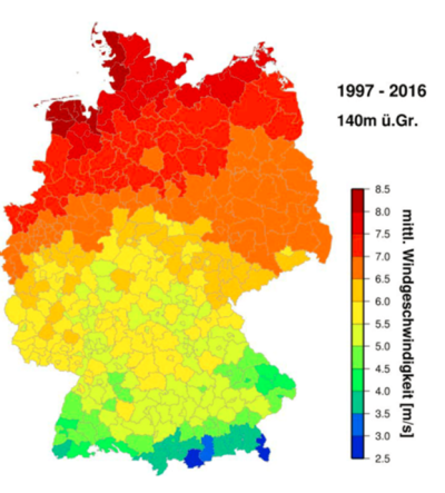Generally, the wind potential over land may already vary significantly within a few metres, especially on complex terrain. High-resolution model simulations are therefore necessary for small-scale wind farm planning. For large-scale planning, there is a characteristic north-south gradient for the wind potential in Germany: wind maps of long-term average wind speeds show the described higher wind speeds in the coastal states down to comparatively low values in the Alpine foothills (see Fig. 2). According to calculations by the Fraunhofer Institute for Wind Energy Systems [BWE 2011, IWES 2013], the future potential of wind energy in Germany is estimated at around 200 GW on land and 54 GW offshore. This means that the gross electricity supply presently in 2019 could be almost met through wind energy alone in the future. However, current obstacles such as the increase in lawsuits against planned wind farm projects and discussions about regulations governing distancing already show the great uncertainties underlying such scenarios.