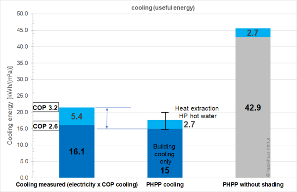 For calculating and measuring the necessary cooling energy, the same procedure was that for heating was used. From the electricity consumption during the summer period using the coefficient of performance of 3.2 for cooling or 2.6 when reduced (75%), the measured cooling energy results as 16.1 to 21.5 kWh/(m²a). This means that for cooling in this climate, this energy-efficient building consumes exactly the same amount of energy as it does for heating.