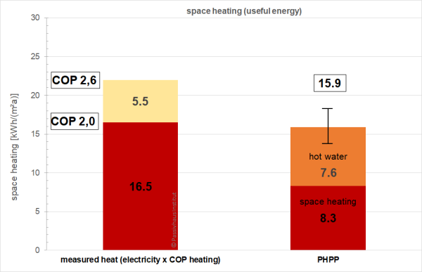 Accordingly, the value of 16.5 to 22.0 kWh/(m²a) includes about 7.6 kWh/(m²a) heat extraction by the hot water heat pump. Consequently, without the influence of the hot water heat pump, about 9 to 14.5 kWh/(m²a) remain for space heating. Thus a very good result is achieved, even with the slightly higher indoor temperature (21.5°C).