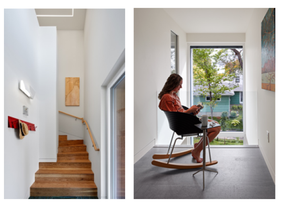 The design is simple and well-proportioned, with an emphasis on function and providing adequate space without being overly large. From cork floors to reclaimed ash wood ceilings and stairs, the materials and surfaces were chosen taking into consideration their impact on the environment and people. The home's exterior is durable, with metal panels installed where the house is difficult to reach for maintenance, and locally-sourced rough-sawn cedar within arm's reach for later upkeep.