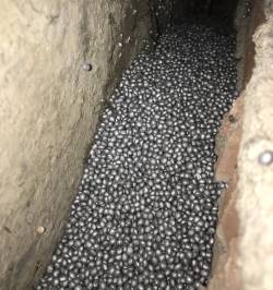 Checking with thermographic imaging is easily possible afterwards because the masonry will become more homogeneous due to the cavity insulation if executed correctly. Any defects will be easily visible in the IR images, but here we also recommend that a professional thermographic imaging expert should be consulted because misinterpretation (warm spots due to sunlight, shading of IR emission) may otherwise often occur with inadequate knowledge of the physics of heat radiation. In the example image on the right, the heaps????? of filling material can be seen, below which the insulation material is already present; the yellow area above this is not filled yet.