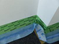 Step 1: Preparation: clean the wall without water (by brushing), if there is existing carpeting, cut and remove a +12 cm strip in front of the wall to be insulated. Remove any cover strips at the edges if present; the gap between the screed and wall will then become visible, inside which there will be a strip of edge insulation. Seal this gap using diffusion-open adhesive tape (a few cm on the floor, a few cm on the wall, see picture)1) . First make sure that routing of electrical lines in the old wall has been marked (Step 0)?