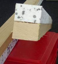 Step 2: prepare the sub-construction: in the case documented here, we bonded a 60 mm x 40 mm standard lath to a piece of EPS material of the same size in order to obtain an insulation holder/support with b =60 mm, h = 80 mm 2) . This will provide an adequate cavity for the insulation material to be inserted, and it will support the interior cladding, is decoupled from noise and heat and is easy to work with {you can also use wood fibre insulation panels if you don't want EPS}; holes are pre-drilled in the supports which are then attached to the wall using dowels/anchors. Sound-decoupling 3) is ensured by means of PE foam tape or cork strips (depending on the type of building material); the edges can be plugged for example with hemp fibre - before sealing (see Step 5). Important: Everything must be airtightly sealed. This will become 'visible' during blowing in the insulation, but it is especially important in order to ensure that the warm moisture-laden indoor air does not carry vast amounts of water vapour towards the now cold old surface. If you wish to understand these processes you can read up on the topic here: What does relative humidity actually mean? (German only)