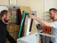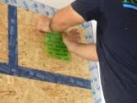 Step 4: cover the inner side with OSB or chipboards. This can also be done quite quickly today using a cordless screwdriver, dismantling again can then be done easily if needed. For even faster work, an electric stapler can be used since there is no reason why the construction should ever be dismantled. It will become an integral part of the exterior wall and in Germany such walls often remain functional for more than a hundred years. The materials used here are not “disposable products”4) . Interestingly, the most important resource here is recycled paper - that is a product that has already been used (once, for a short time) - which is now “stored” and therefore escapes being burnt (CO2!) and in this way contributes even further to climate protection.