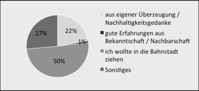 In the first quarter of 2015, Heidelberg’s Office of Environmental Protection, Commerce and Energy conducted a survey of all 1,500 households in the Bahnstadt at the time. The households received the questionnaire in the mail, and the survey was also made public in a local newspaper and on the Bahnstadt’s website. The 25 questions were estimated to take ten minutes to answer. Within the deadline of three weeks, 245 questionnaires were returned, equivalent to a response rate of 16.3 %.