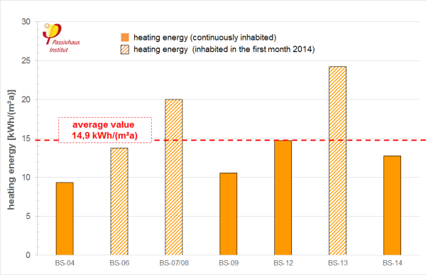 Figure 2 shows consumption of heating energy in the residential buildings by complex along with the average area-weighted values. Different boundary weather conditions in the next year under review are expected to produce slightly different results; furthermore, 2015 will be the first year of complete usage throughout the year, and the one-off effects from the first year will be over. One focal point will be on whether the two higher consumption values(20 and 24 kWh/(m²a), respectively) change under full occupancy. In any case, even these levels are very low and cannot be seen as problematic.