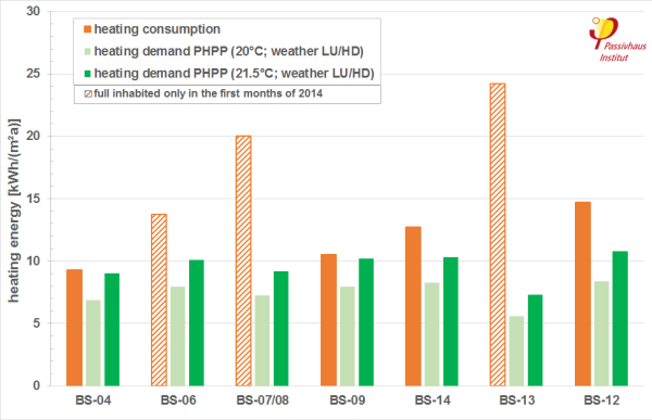 Figure 3 shows consumption values for heating energy in the complexes along with the PHPP results (for 20.0 and 21.5 °C).
