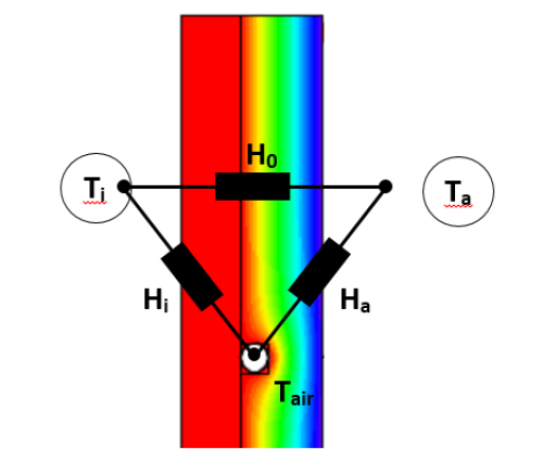 As shown in the illustration, this situation can be modelled using a delta circuit of conduct-ance values H in W/(mK) between the temperatures mentioned above. Due to the linearity of the heat conduction equation, it is enough to determine the conductance values once using a 2D heat flow calculation for any temperature. In Figure 1 for example, Ti=Tair, heat flow over the internal surface is then H0(Ti-Ta), heat flow over the surface of the ventilation duct is Ha(Tair-Ta). For other temperature combinations, the heat flows can then be calculated using the same conductance values (superposition principle).