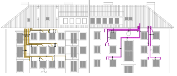 If old buildings are equipped with ventilation systems with heat recovery as part of a refur-bishment, it often offers advantages if the supply and extract air ducts can be installed out-side the home for the most part. Among other things, less work is required inside occupied flats in this case. One option is to lay the ducts on the outside of the existing external wall and then cover them with thermal insulation. With prefabricated insulation elements, it makes sense to install the ventilation ducts in the elements at the factory. The heat recovery unit can be located either outside the thermal envelope, e.g. in an uncon-ditioned attic, or inside the building / the flats. This type of installation results in additional transmission heat losses. It must also be taken into account that the air flowing in the ducts changes its temperature, which affects the ven-tilation losses. Based on a detailed analysis (see below) it was found that the following points must be considered.