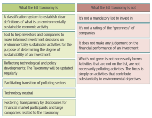 The EU taxonomy is a cornerstone of the EU's sustainable finance framework and a market transparency tool. It helps to channel investment into the sectors of the economy that the EU considers most urgently needed for the transition, in line with the objectives of the European Green Deal. The taxonomy is a classification system that sets out criteria for economic activities that are consistent with a net-zero profile by 2050 and the broader environmental objectives in addition to climate action.